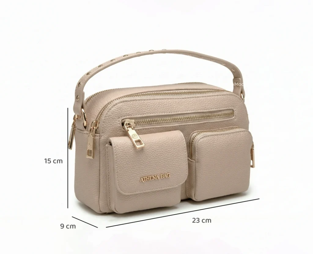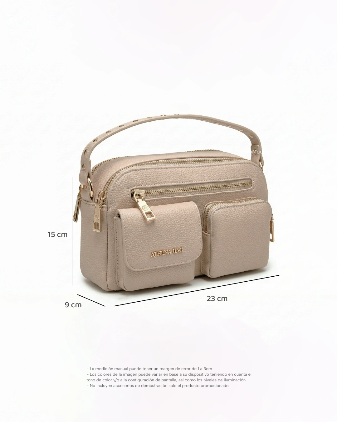El modelo Africa presenta unas medidas de 23 cm de largo por 15 cm de alto, diseñadas para ofrecerte una experiencia ligera y funcional. A pesar de su apariencia compacta, su profundidad de 9 cm y sus bolsillos externos maximizan el espacio interior, permitiéndote llevar tu billetera, celular y cosméticos de forma organizada y segura.