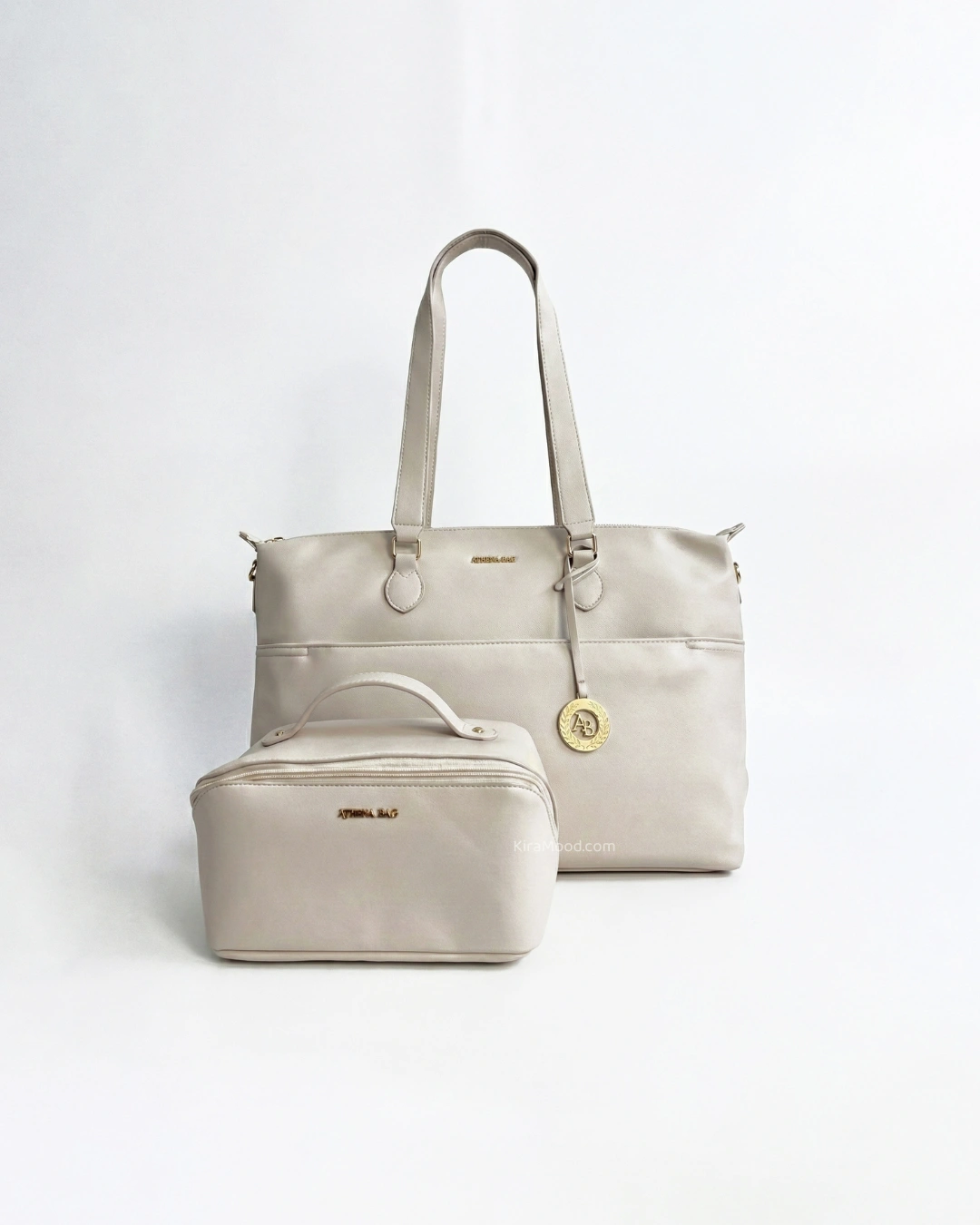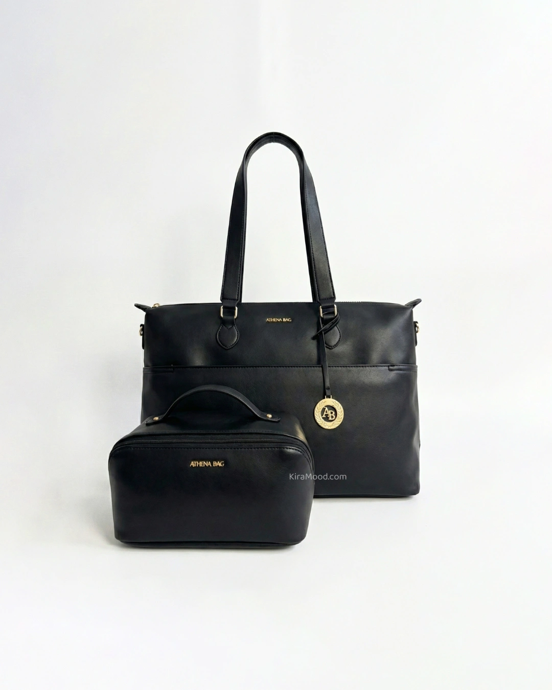 El complemento perfecto. El set incluye un neceser de alta capacidad con asa superior, ideal para tus cosméticos o accesorios electrónicos. Su apertura amplia y sus bolsillos internos con elástico y cierre te permiten visualizar y organizar todo tu contenido fácilmente, manteniéndolo separado del resto de tu bolso.